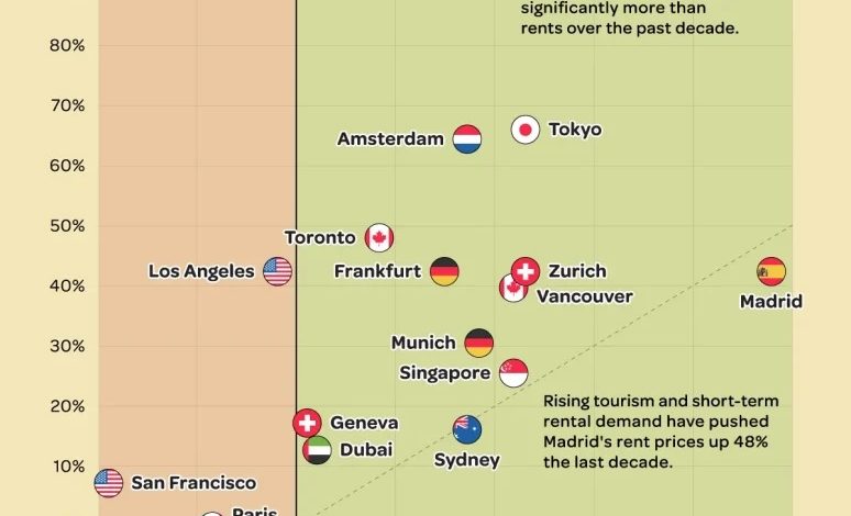 در ۱۰ سال گذشته، مادرید شاهد افزایش ۴۲.۴ درصدی قیمت مسکن بوده است، در حالی که اجاره ها ۴۸ درصد رشد کردند؛ بیشترین افزایش اجاره در میان تمام شهرهای بزرگ جهان. این موضوع بازتاب دهنده رونق بخش اجاره های کوتاه مدت و بازگشت گردشگری در اسپانیاست.