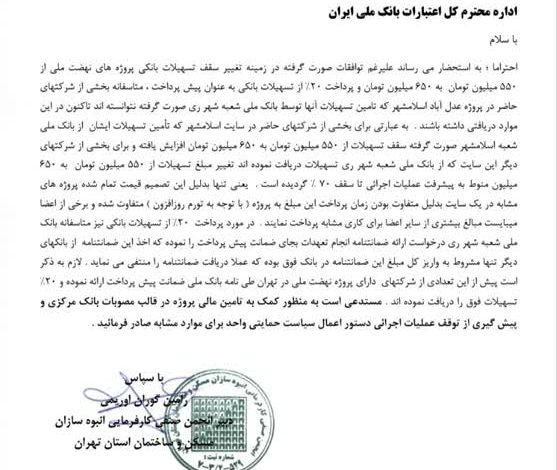 احتراما؛ به استحضار مى رساند علیرغم توافقات صورت گرفته در زمینه تغییر سقف تسهیلات بانكى پروژه هاى نهضت ملى از 550 میلیون تومان به 650 میلیون تومان و پرداخت 20 درصد از تسهیلات بانكى به عنوان بیش پرداخت، متاسفانه بخشى از شركتهاى حاضر در پروژه عدل آباد اسلامشهر كه تامین تسهیلات آنها توسط بانک ملى شعبه شهر رى صورت گرفته نتوانسته اند تاكنون در این موارد دریافتى داشته باشند. به عبارتى براى بخشى از شركتهاى حاضر در سایت اسلامشهر كه تأمین تسهیلات ایشان از بانک ملى شعبه اسلامشهر صورت گرفته سقف تسهیلات از 550 میلیون تومان به 650 میلیون تومان افزایش یافته و براى بخشى از شر كتهاى دیگر این سایت كه از بانک ملى شعبه شهر رى تسهیلات دریافت نموده اند تغییر مبلغ تسهیلات از 550 میلیون تومان به 650 میلیون منوط به پیشرفت عملیات اجرائى تا سقف 70 درصدی گردیده است. یعنى تنها بدلیل این تصمیم قیمت تمام شده پروژه هاى مشابه در یک سایت بدلیل متفاوت بودن زمان پرداخت این مبلغ به پروژه (با توجه به تورم روزافزون) متفاوت شده و برخى از اعضا میبایست مبالغ بیشترى از سایر اعضا براى كارى مشابه پرداخت نمایند. در مورد پرداخت 20 درصد از تسهیلات بانكى نیز متاسفانه بانک ملى شعبه شهر رى درخوست ارائه ضمانتنامه انجام تعهدات بجاى ضمانت پیش پرداخت را نموده كه اخذ این ضمانتنامه از بانكهاى دیگر تنها مشروط به واریز كل مبلغ این ضمانتنامه در بانك فوق بوده كه عملا دریافت ضمانتنامه را منتفى مى نماید. لازم به ذكر است پیش از این تعدادى از شركتهاى داراى پروژه نهضت ملى در تهران طى نامه بانک ملى ضمانت پیش پرداخت ارائه نموده و 20 درصد تسهیلات فوق را دریافت نموده اند. مستدعى است به منظور کمک به تامین مالى پروژه در قالب مصوبات بانک مركزى و پیشگیرى از توقف عملیات اجرائى دستور اعمال سیاست حمایتى واحد براى موارد مشابه صادر فرمائید.