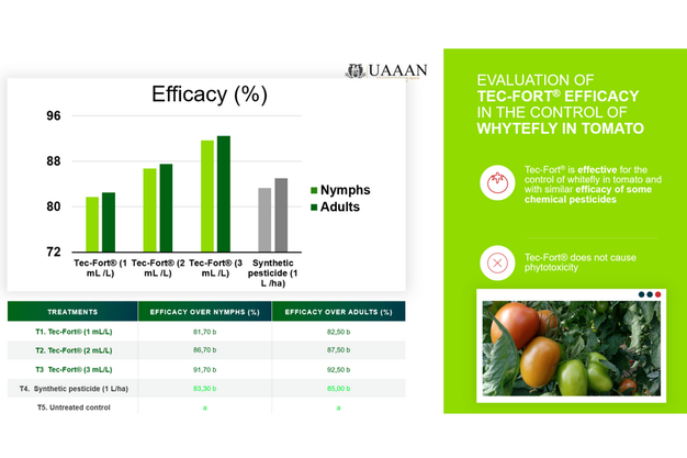 آزمایشات مزرعه ای که با همکاری دانشگاه کشاورزی آنتونیو نارو در مکزیک انجام شد، اثربخشی Tech Forte را در کنترل آفات در محصولات عمده ای مانند کاهو، گوجه فرنگی، گل کلم و توت فرنگی نشان داد. به عنوان مثال، مطالعات روی محصولات گوجه فرنگی اثربخشی بالایی را در برابر مگس های سفید نشان داده اند و نتایجی مشابه با برخی حشره کش ها به دست می آورند و در عین حال از خطر سمیت گیاهی جلوگیری می کنند.