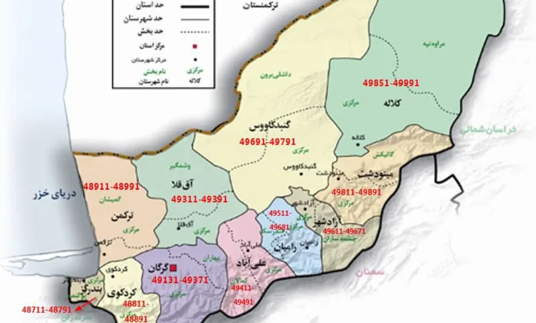 بر روی نقشه رنج کد پستی شهرهای استان گلستان نوشته شده است.