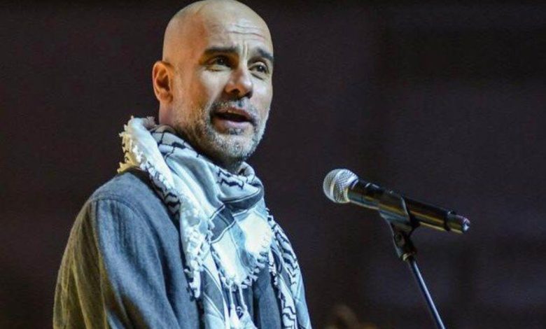 سرمربی منچسترسیتی یک روز پس از بازی با گالاتاسارای در ورزشگاه اتحاد، به زادگاه خود بازگشت و در حالی که چفیه سیاهوسفید فلسطینی بر گردن داشت، روی صحنه رفت. او در سخنانش از کودکانی گفت که در جریان جنگ غزه، والدین خود را از دست دادهاند.